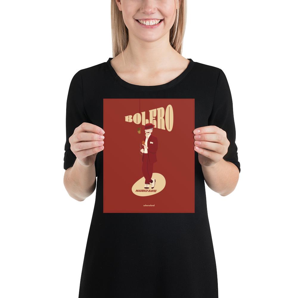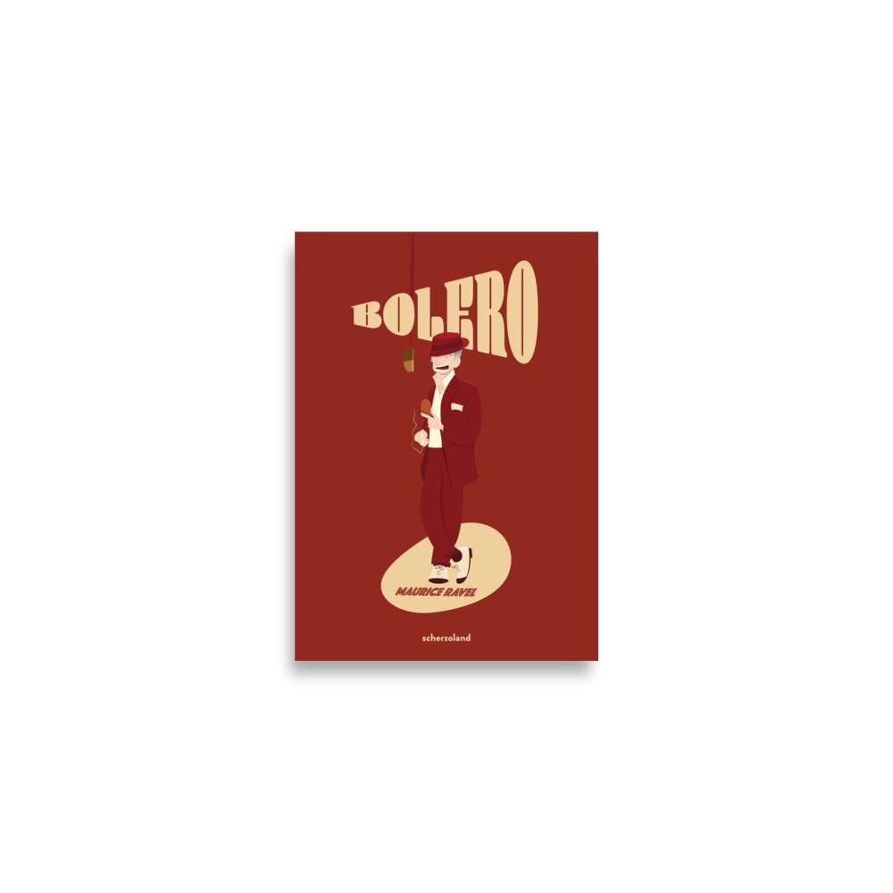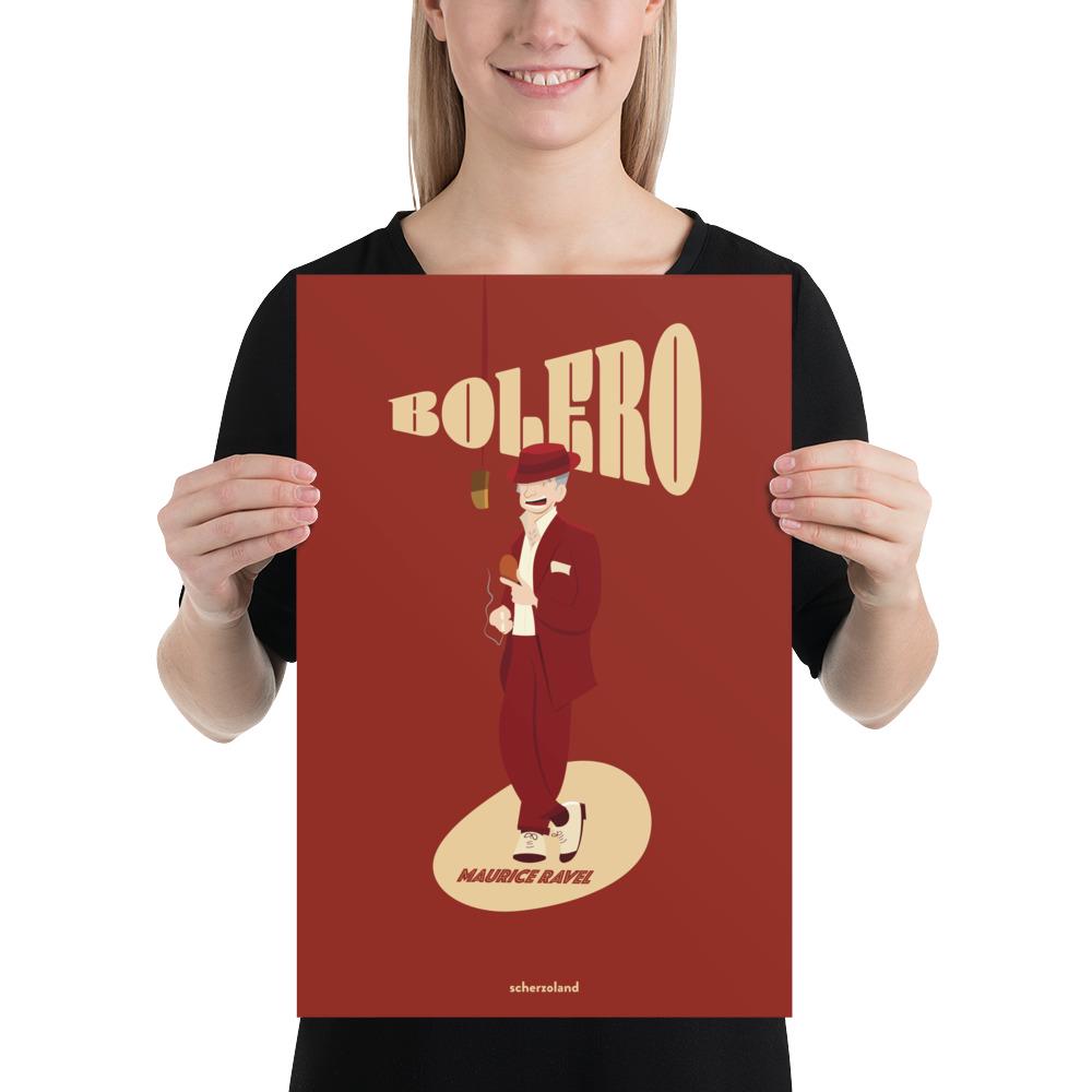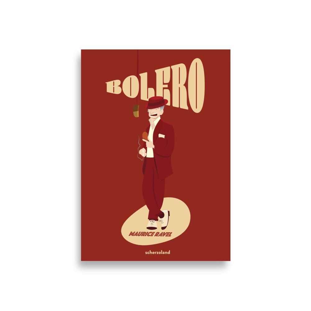 Unique and fun Ravel Bolero poster playing with the title as the musical piece grows in volume also the title. and Ravel singing a bolero.
